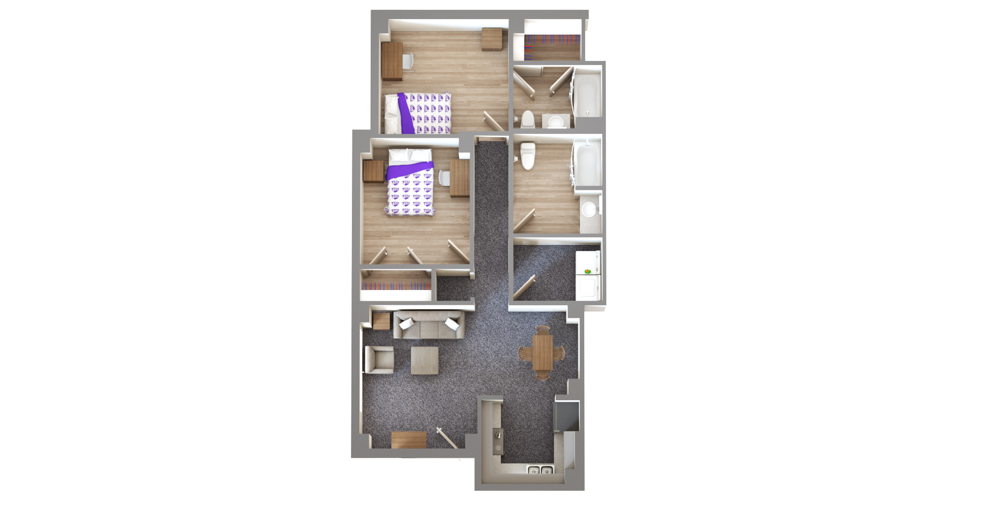 McCart is a small community on the east edge of campus, giving residents an on-campus experience with an off-campus feel. Junior/Senior residents live in fully furnished two-bedroom apartments with parking right outside their front door. Each apartment comes equipped with a kitchen, cable, internet, and all utilities.